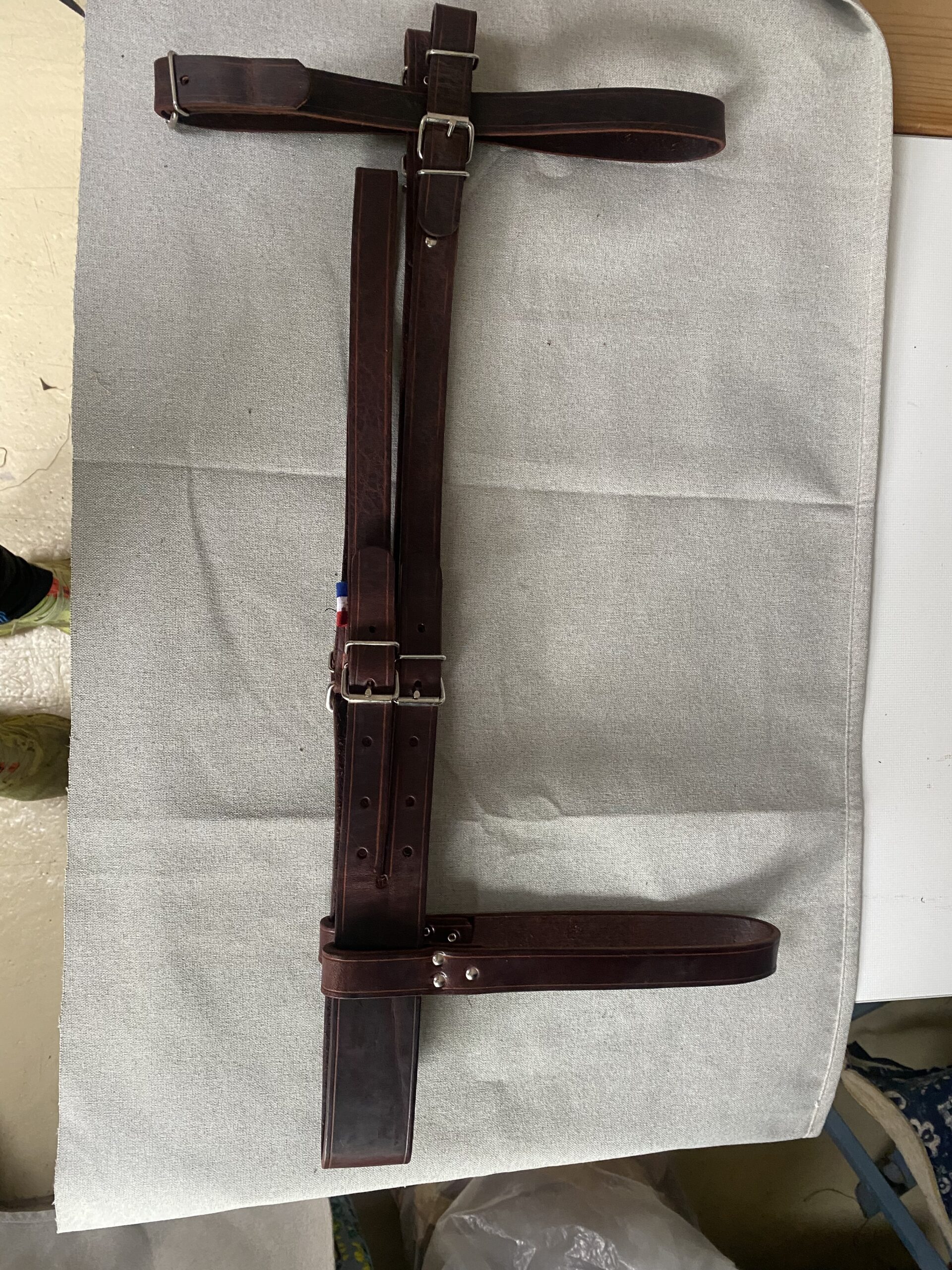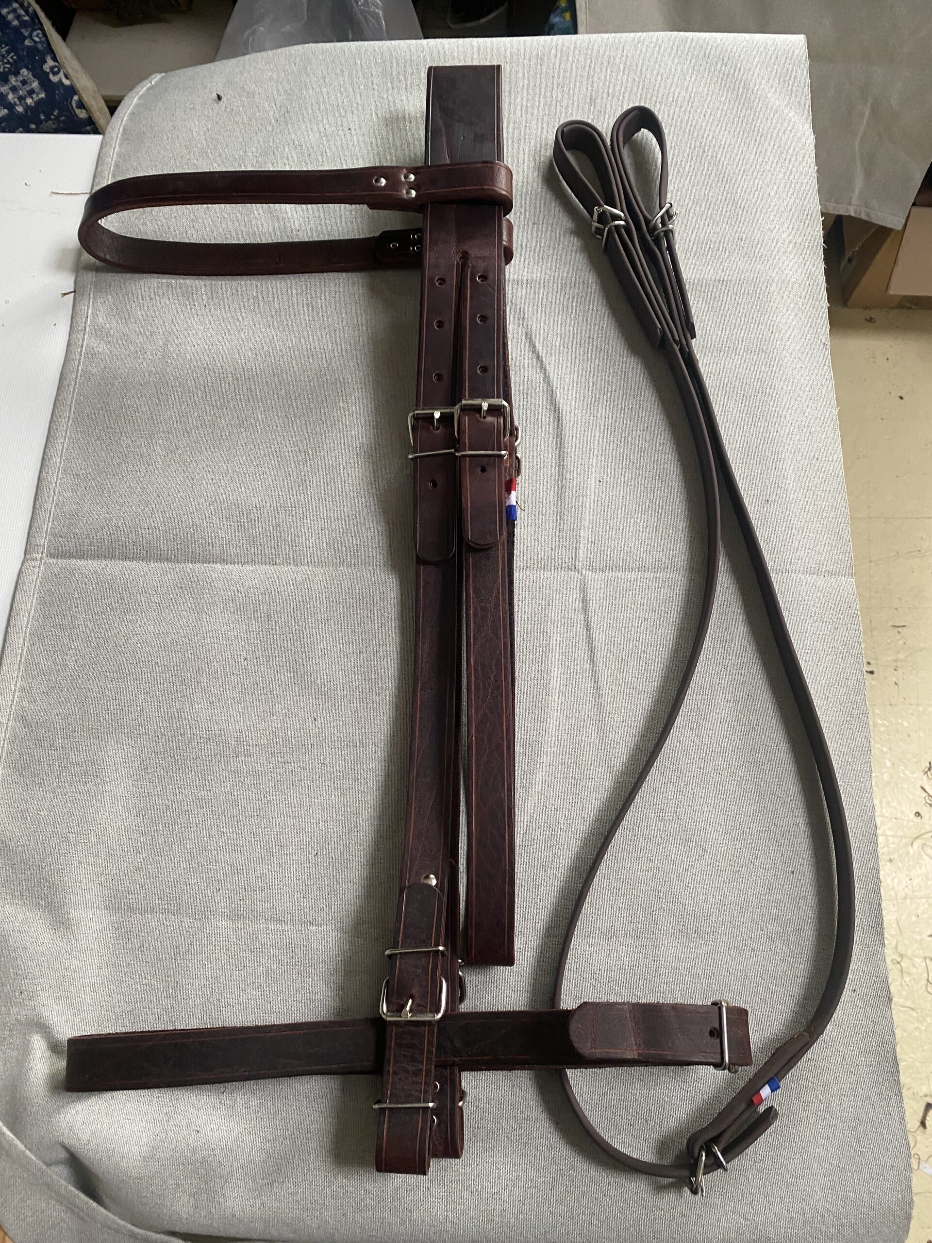 Cuir chromé riveté. Réglable, livrée à vos mesures. Pour fixer un mors pour la promenade ou l’attelage.