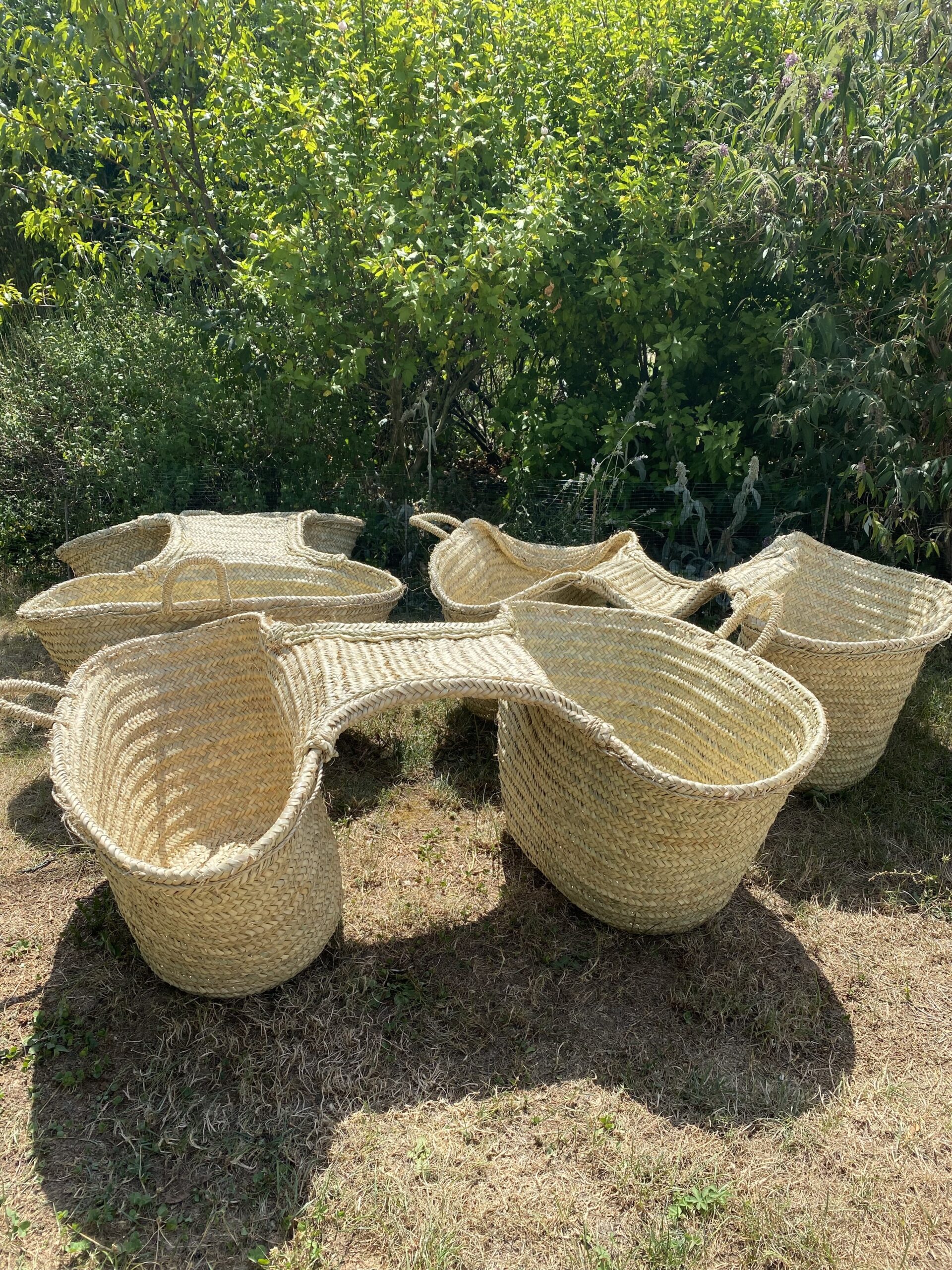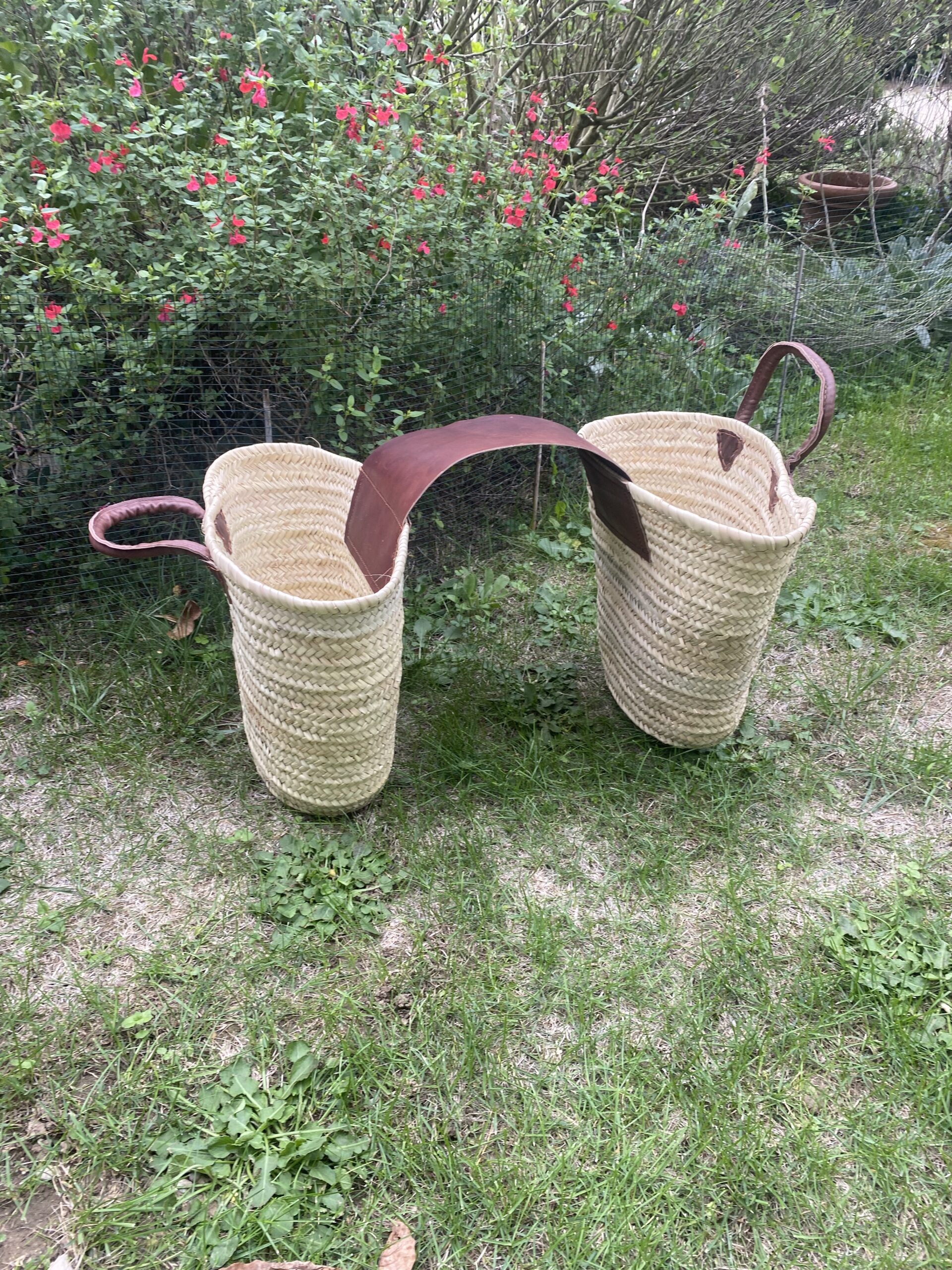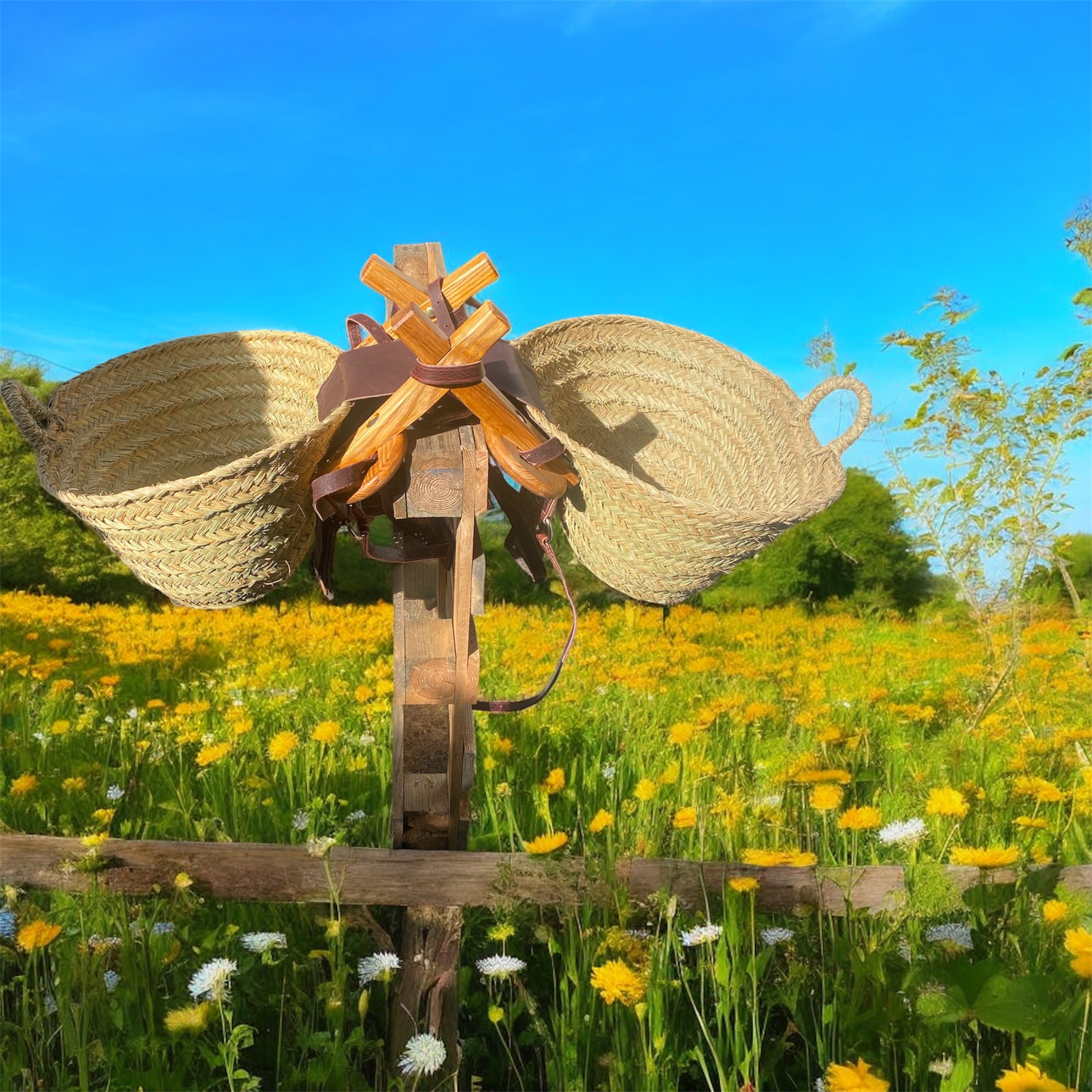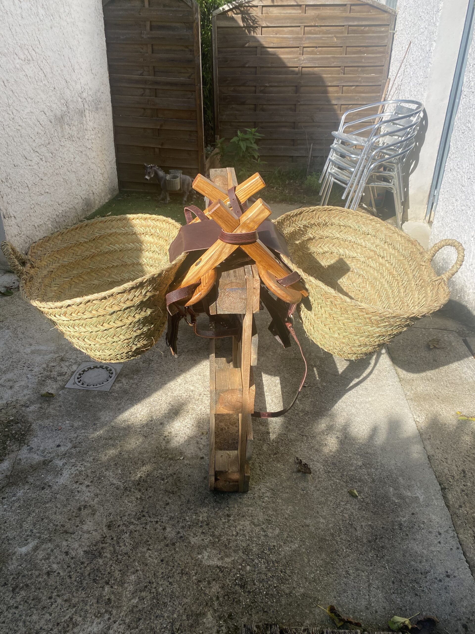 En fibres de palmier, très solides. Double panier relié entre eux qui se pose directement sur le bât.