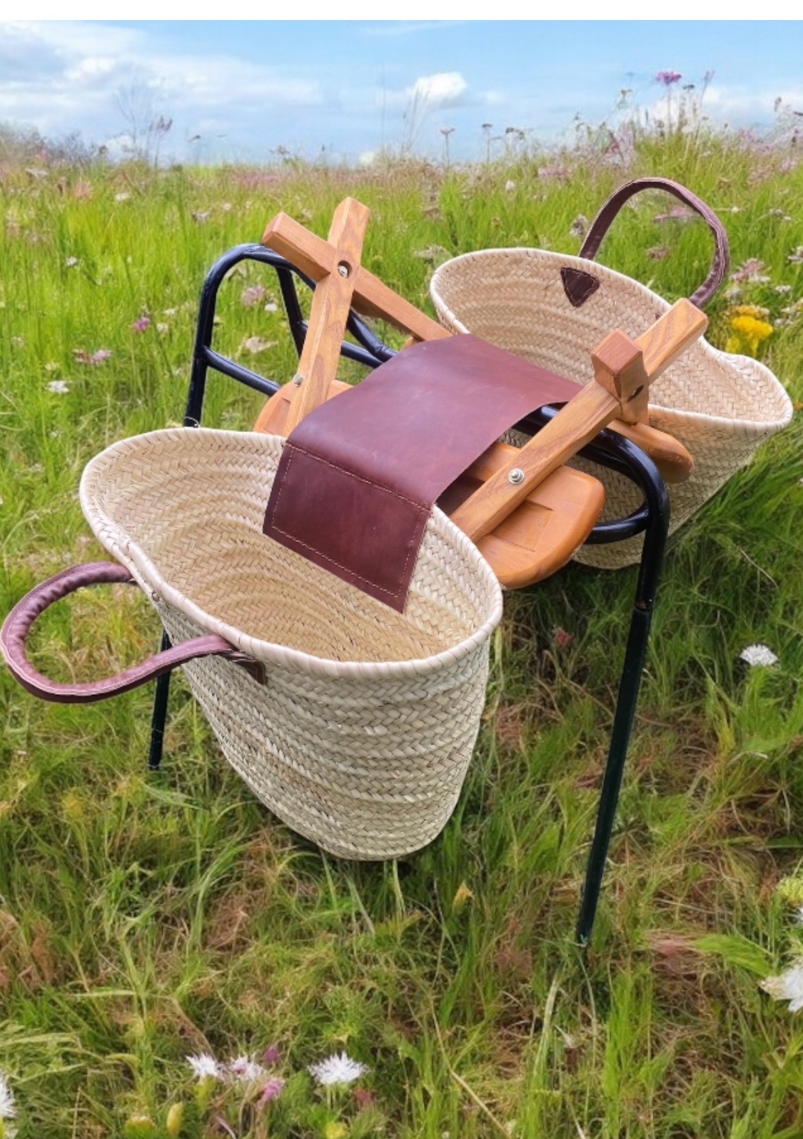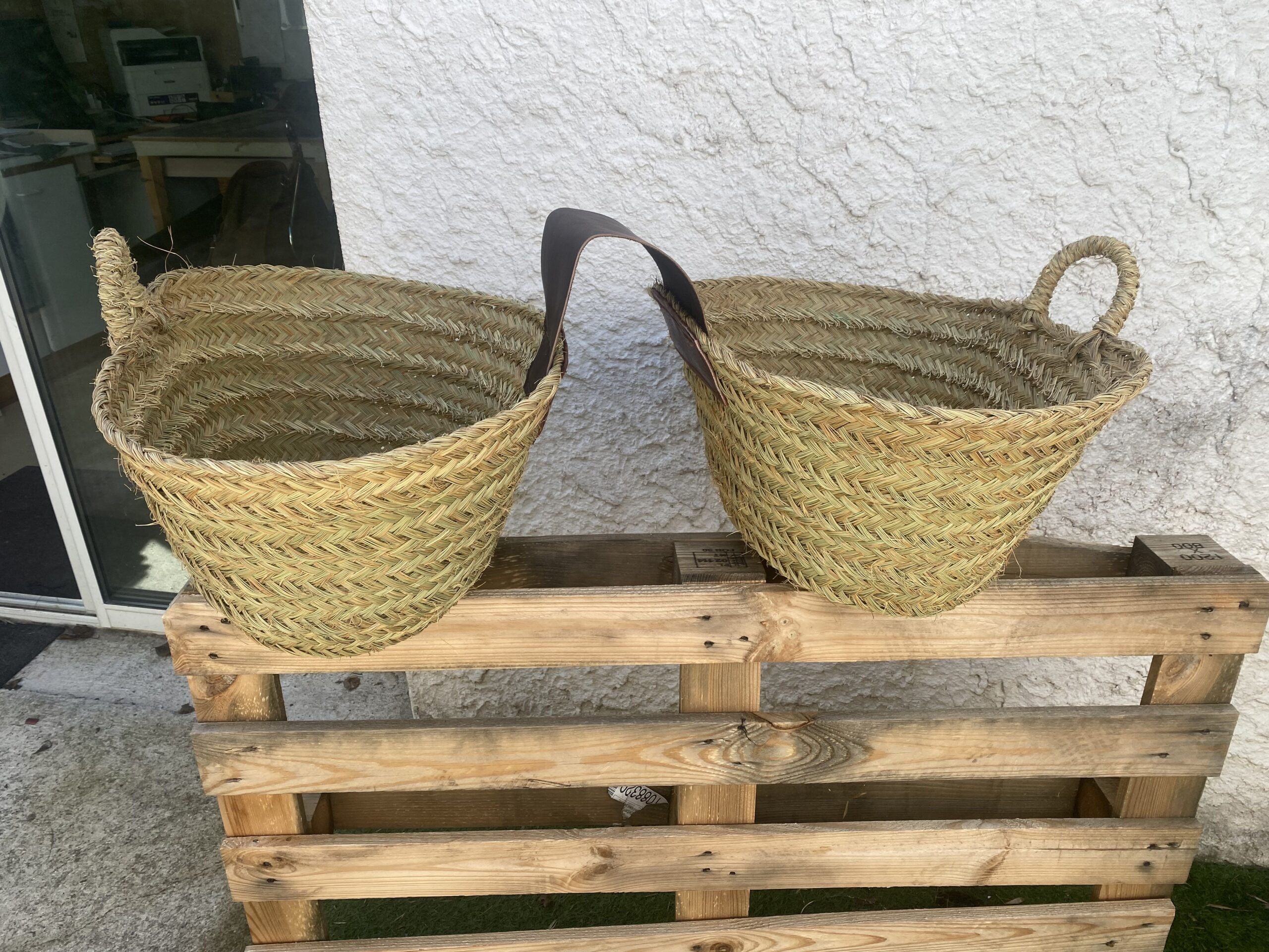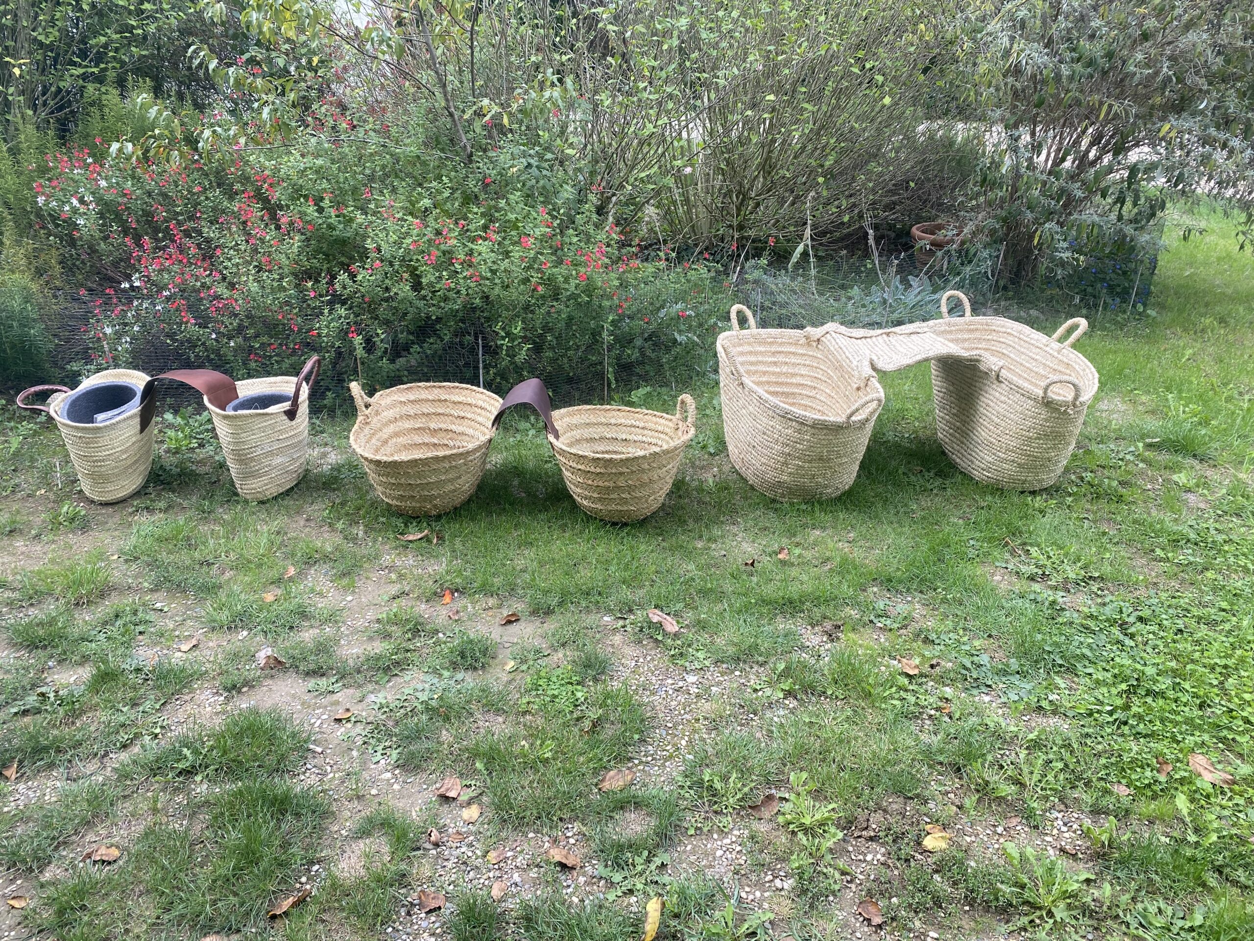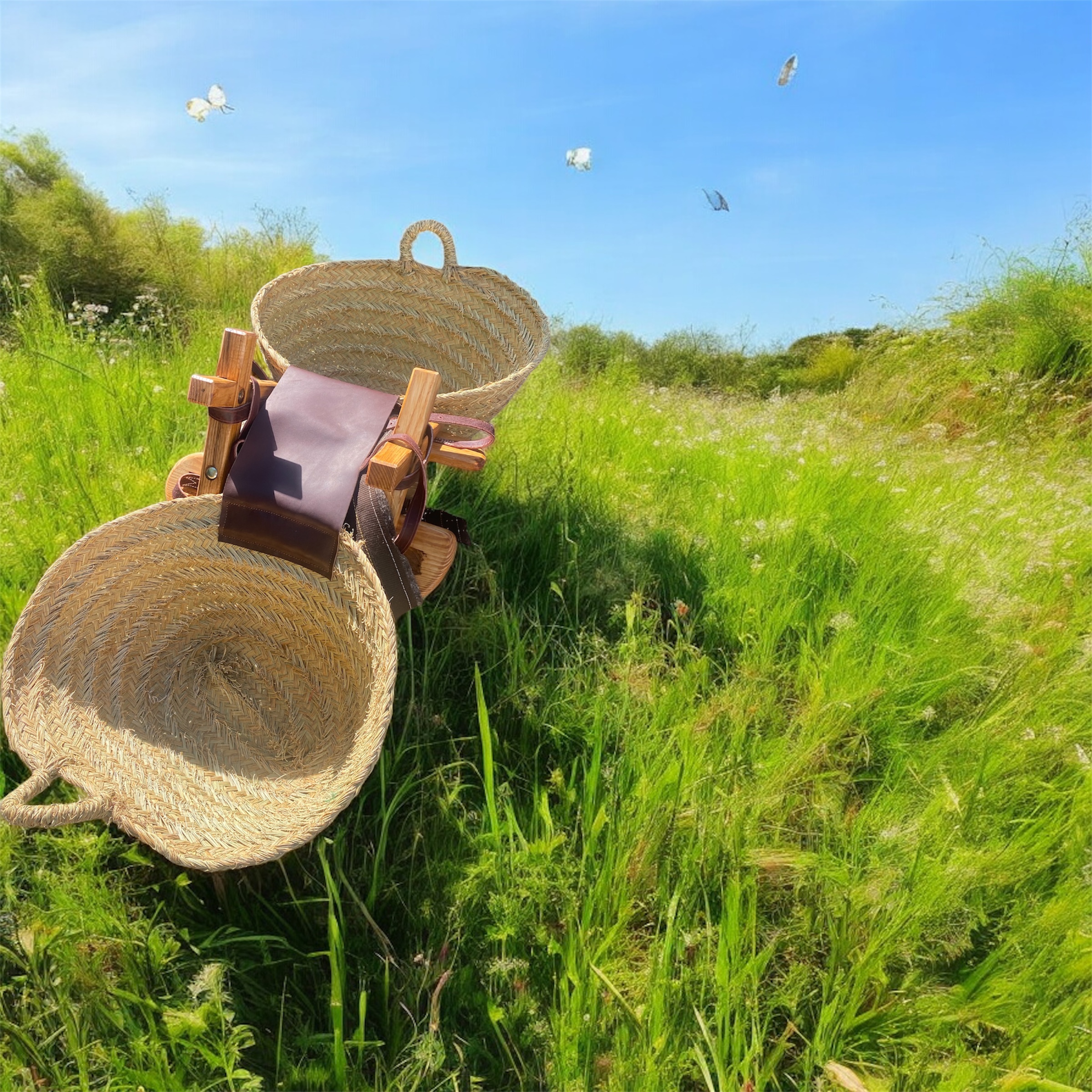 En fibres de palmier, très solides. Double panier relié entre eux qui se pose directement sur le bât.
