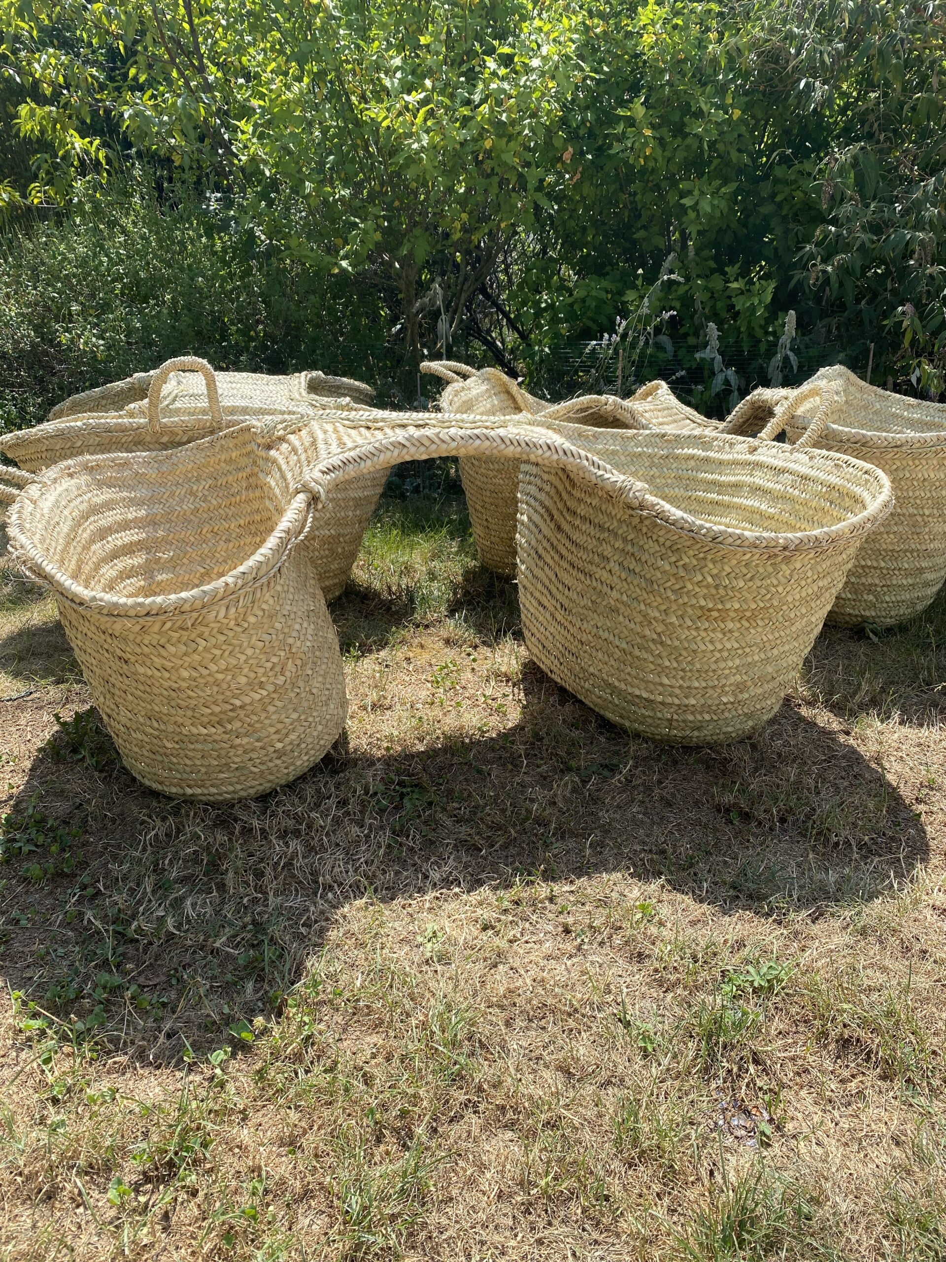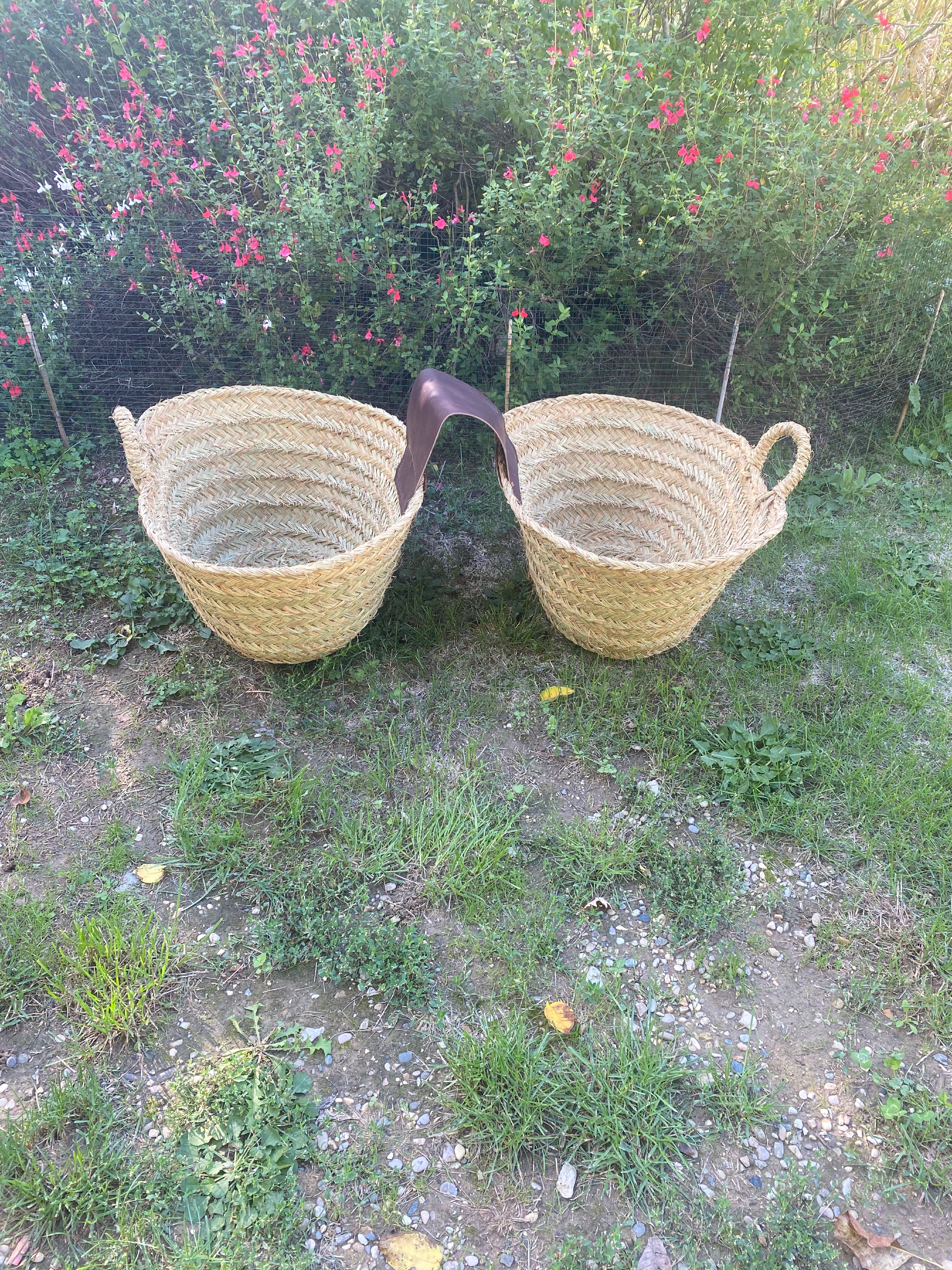 Grand modèle : longueur totale 130 cm, hauteur 12 tours, diamètre du fond 40×50 cm écartement entre les 2 paniers 40cm