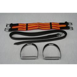 Tout le nécessaire pour équiper la selle référence 107 soit: 1 paire d’étrivière en cuir + 1 paire d’étrier en fer nickelé + 1 sous ventrière en coton à la mesure choisie.