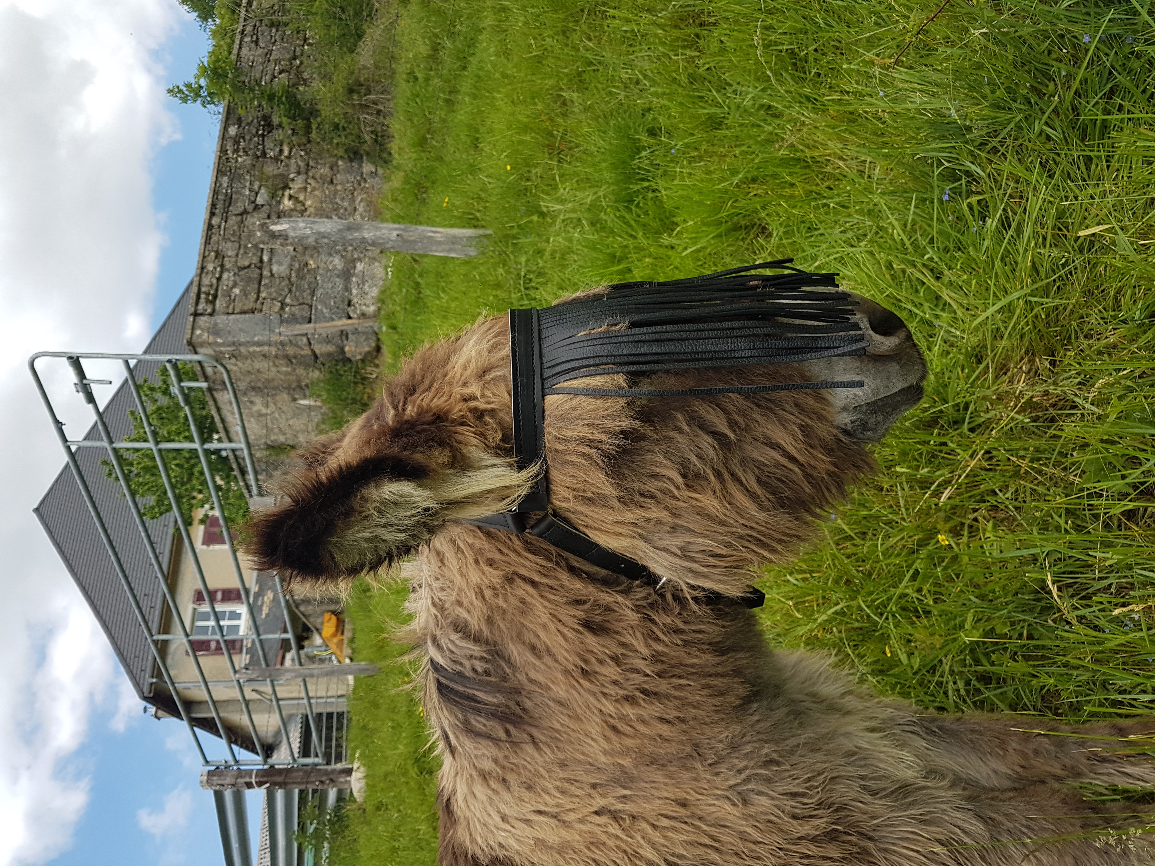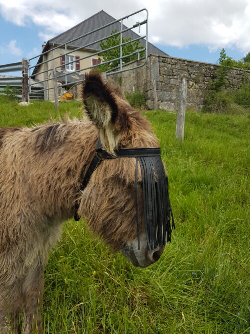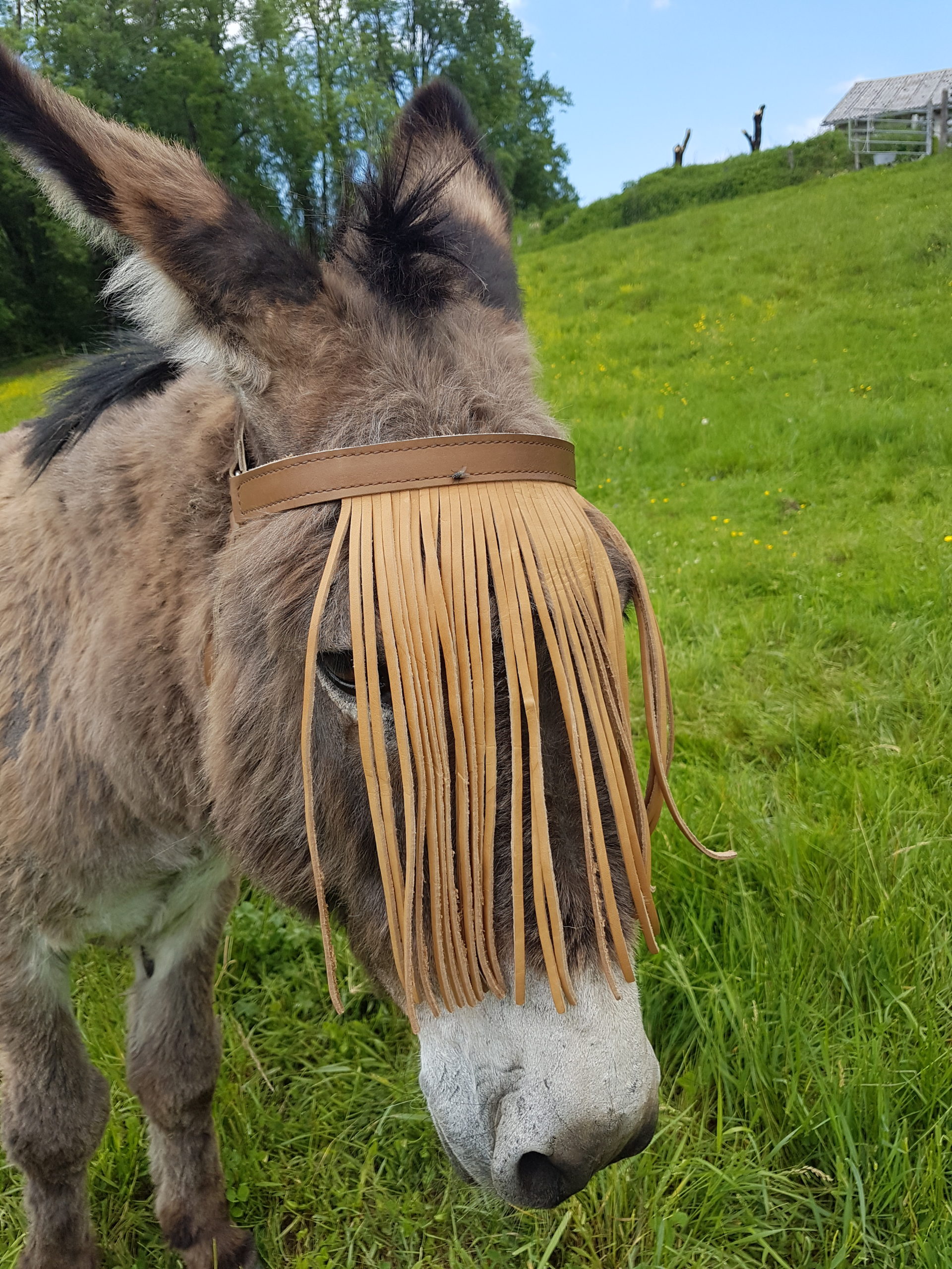 Ce frontal en cuir de notre fabrication dans notre atelier en Ardèche est idéal pour laisser les ânes au pré sans licol et que les mouches ne les embêtent pas ! Il est solide et réglable à la sous gorge par une boucle.