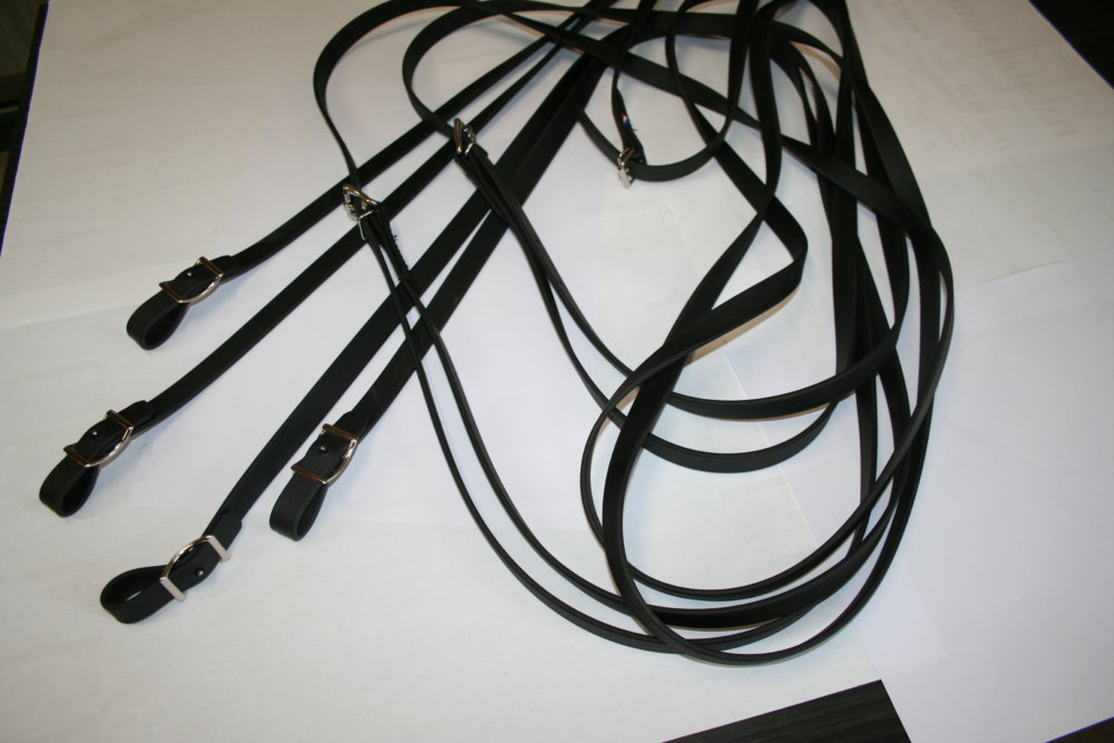 Guides en biothane pour attelage en couple, très belle qualité, en une seule longueur sans rajout, idéal pour bien coulisser dans les anneaux du harnais, boucleries à rouleau inox pour fixer au mors et pour le réglage des croisières.