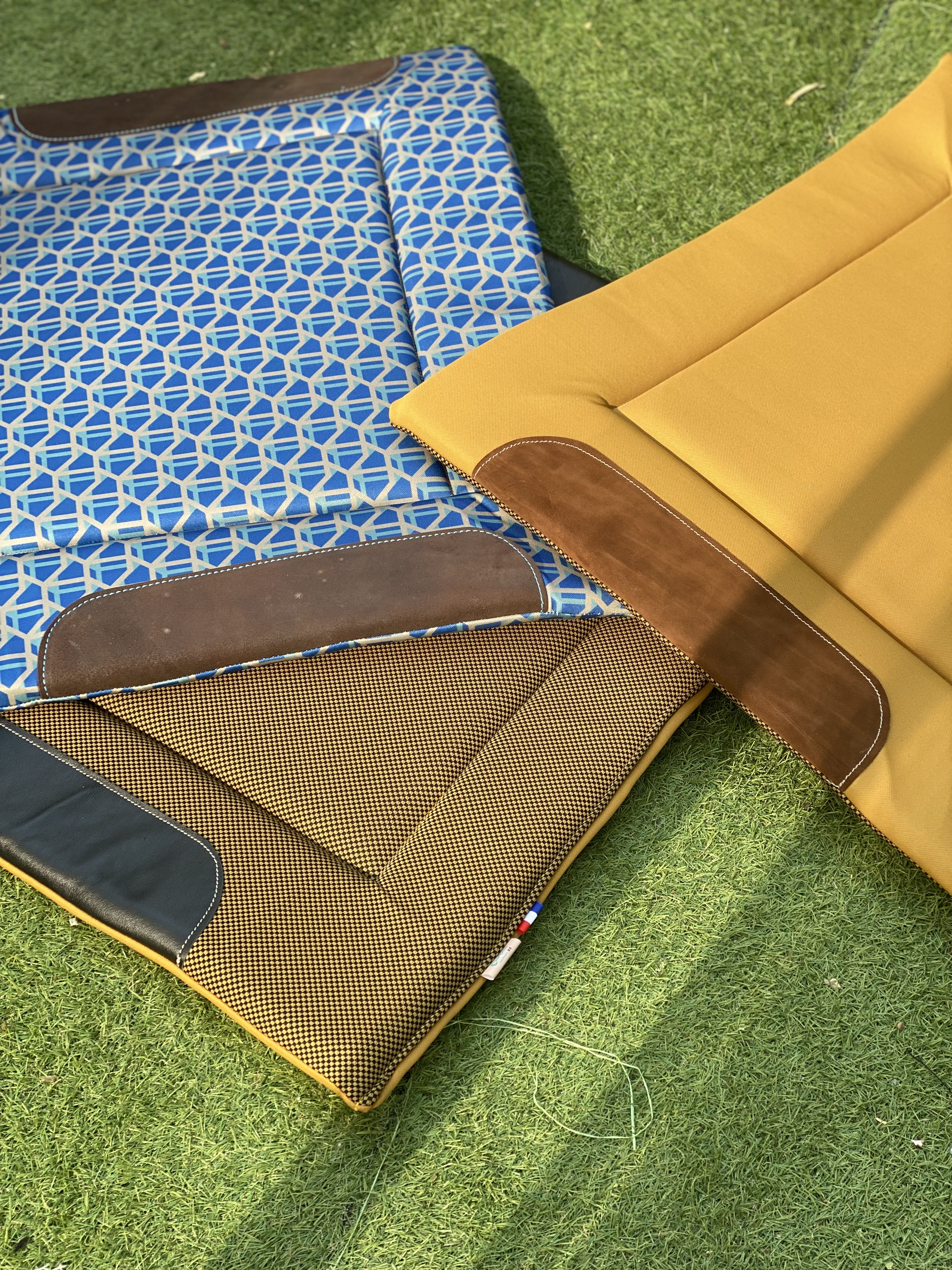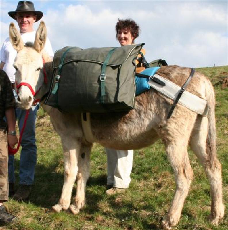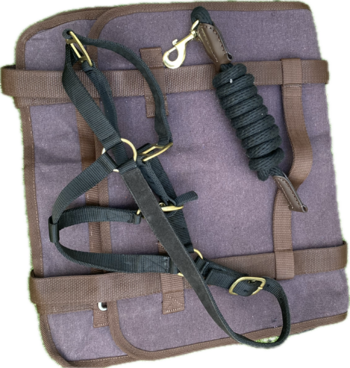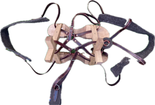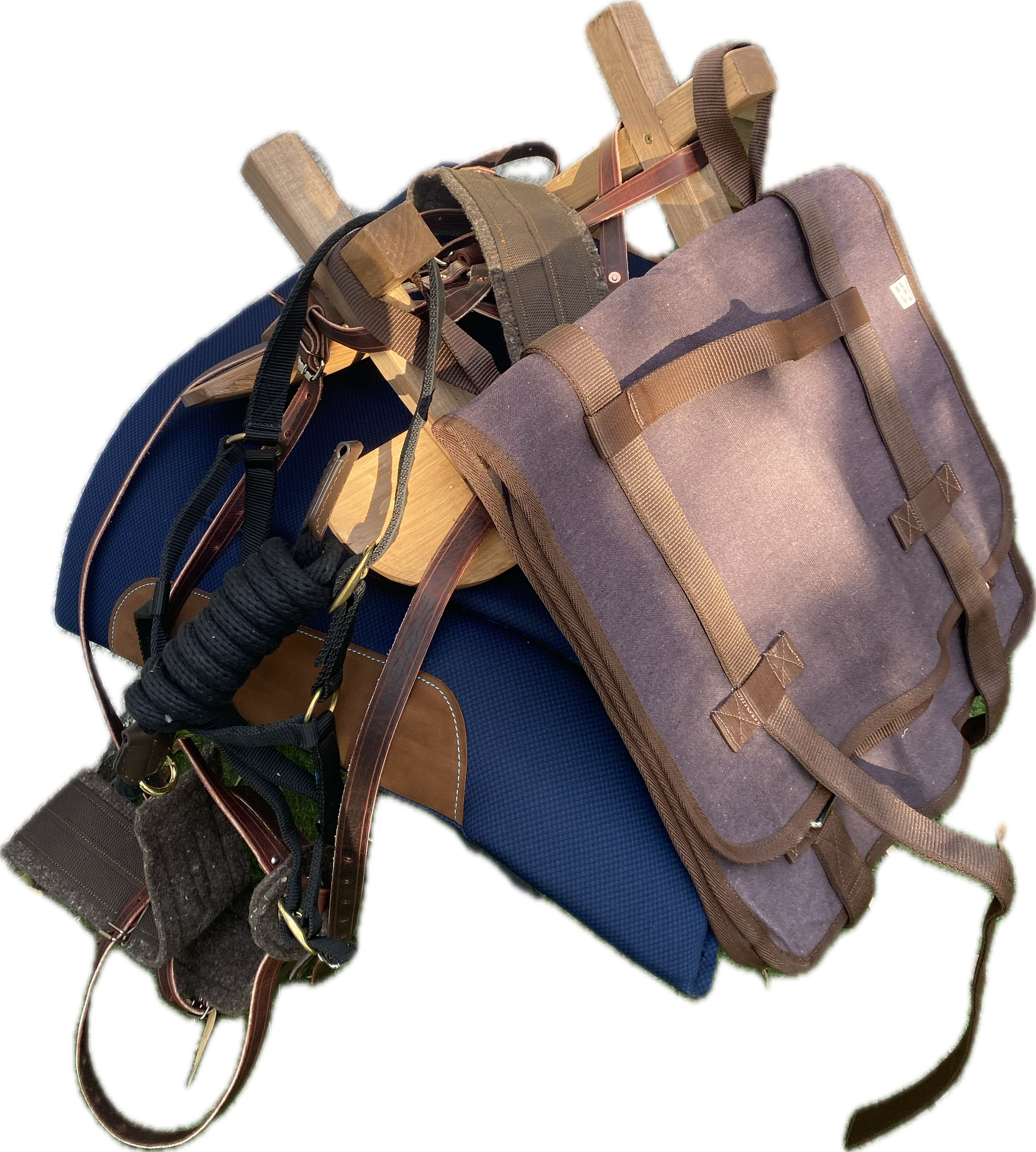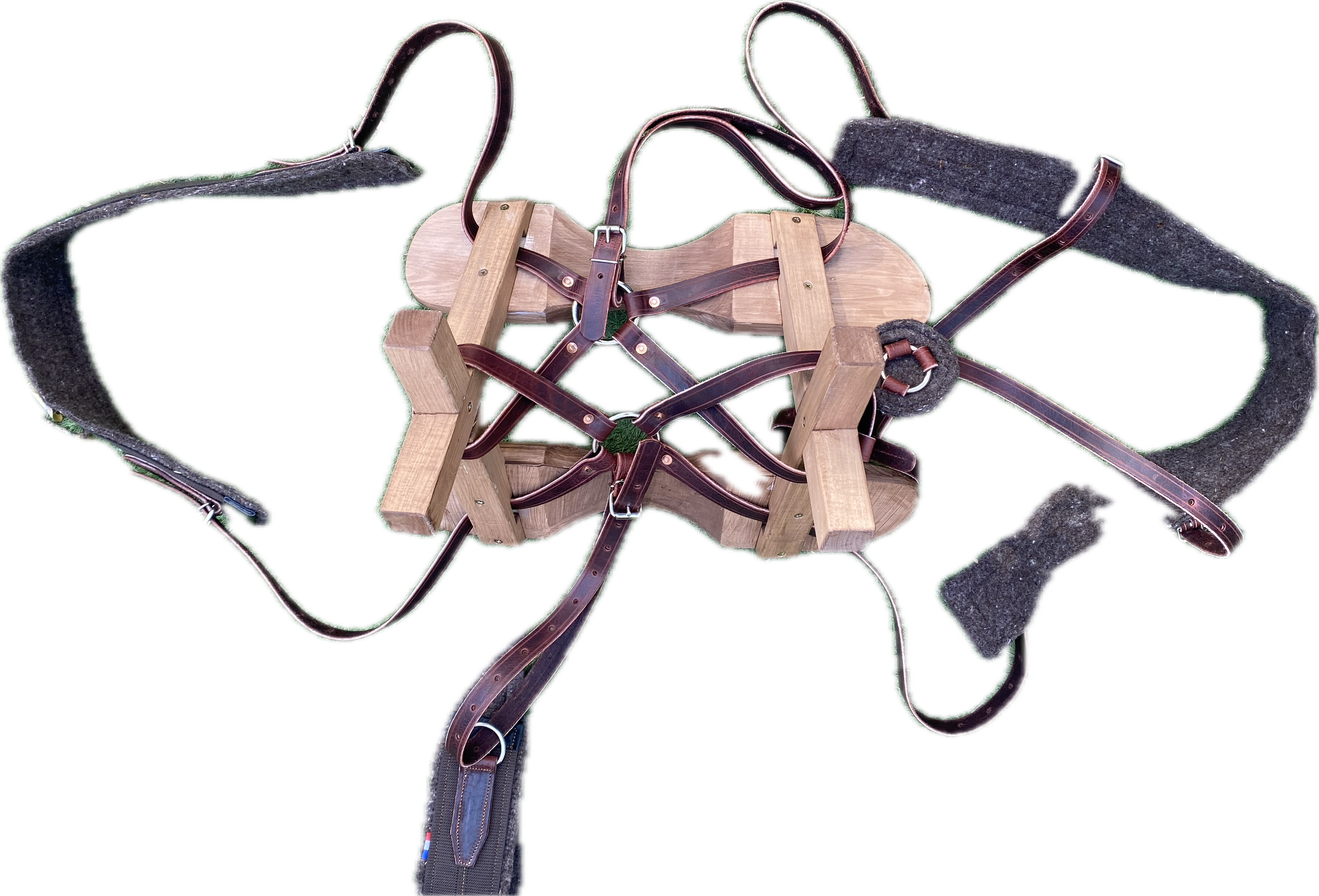 BAT ‘BASIC ( réf 401 ). Sangles réglables en cuir rivé, bricole, avaloir et sous-ventrière en coton doublé de feutre lainé ( voir réf 919, 920 et 921 ) . Idéal pour la randonnée + Tapis de bât épais avec intérieur en mousse (réf 412), protection cuir, passage de sangle. Dimensions 75 x 75cm environ. Idéal pour de petites et moyennes randonnées + SACOCHES toile épaisse (réf 428). Sanglage en nylon de 4 cm qui entoure la sacoche, fermeture du dessus par zip pour une garantie de ne rien perdre ! Fixation nylon par boucle sur les croisillons du bât. Dimensions 55 x 45 x 25 cm. + LICOL NYLON Doublé CUIR ( Réf 134 ) . Belle qualité. Deux réglages, trois tailles. Coloris assortis + Longe ( réf 146) en nylon, mousqueton tournant .