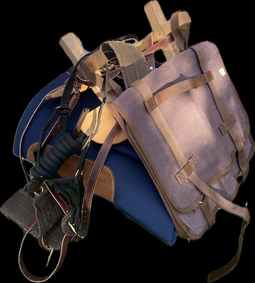 BAT ‘BASIC ( réf 401 ). Sangles réglables en cuir rivé, bricole, avaloir et sous-ventrière en coton doublé de feutre lainé ( voir réf 919, 920 et 921 ) . Idéal pour la randonnée + Tapis de bât  épais avec intérieur en mousse (réf 412), protection cuir, passage de sangle. Dimensions 75 x 75cm environ. Idéal pour de petites et moyennes randonnées + SACOCHES toile épaisse (réf 428). Sanglage en nylon de 4 cm qui entoure la sacoche, fermeture du dessus par zip pour une garantie de ne rien perdre ! Fixation nylon par boucle sur les croisillons du bât. Dimensions 55 x 45 x 25 cm. + LICOL NYLON Doublé CUIR ( Réf 134 ) . Belle qualité. Deux réglages, trois tailles. Coloris assortis + Longe ( réf 146)  en nylon, mousqueton tournant .