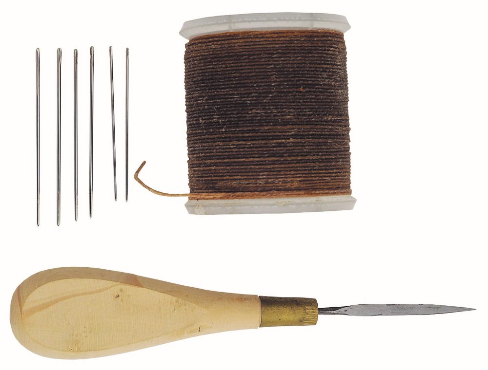 Comprenant une bobine de fil poissé, 6 aiguilles, 1 alène plus manche bois.