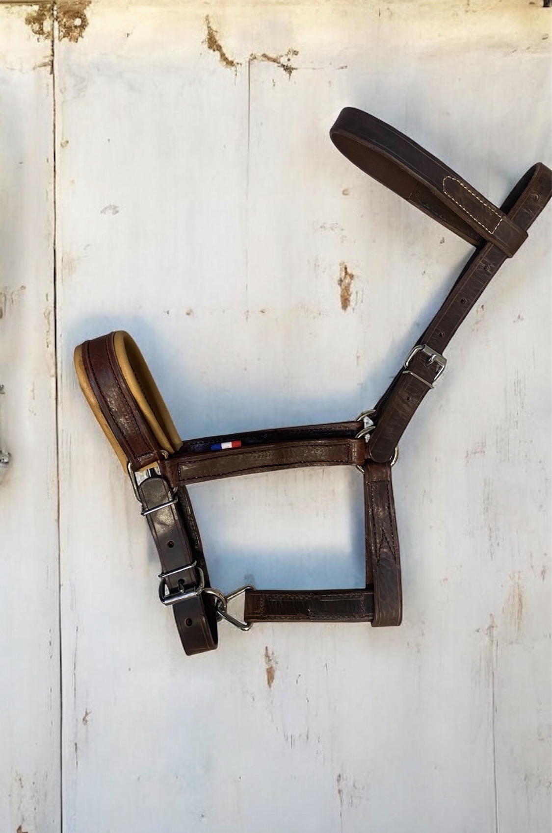 Ce licol pour âne est entièrement fabriqué à la main dans notre atelier Cab’âne en Ardèche, avec le plus grand soin. Réalisé en cuir chromé et équipé d’un frontal pour un maintien idéal, il allie confort et élégance. Nous serons ravis de le créer spécialement à vos mesures. »