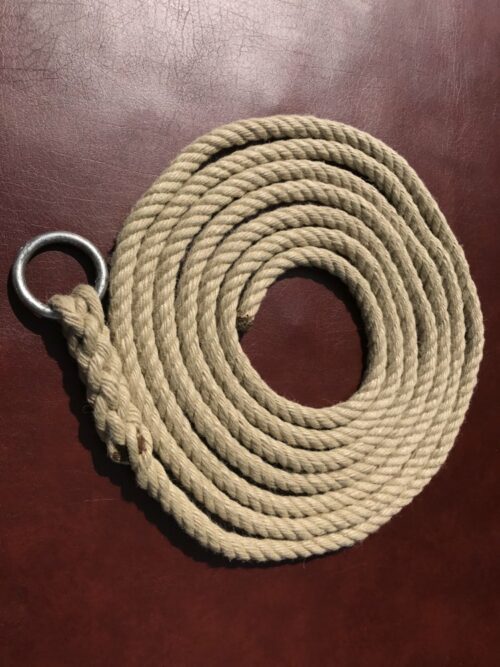 Longe en polypropylène imitation chanvre très solide et douce au toucher, épissure avec gros anneau soudés en bout , idéal pour randonner. Dimensions sur mesure possible se renseigner ou possibilité de mettre un anneau de chaque côté ou mousqueton.