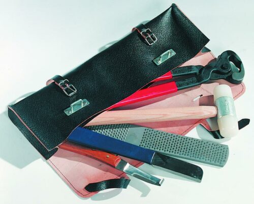 Trousse de maréchal PM composée d’une pince à parer( réf 289), d’un rogne pied (réf 281 ) , d’une râpe de maréchalerie sans manche (réf 286 ), d’une mailloche nylon( réf 296 )et d’une rénette ( réf 285 ).
