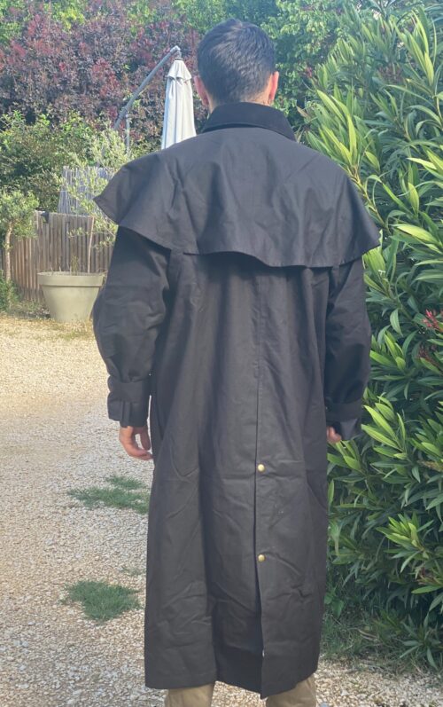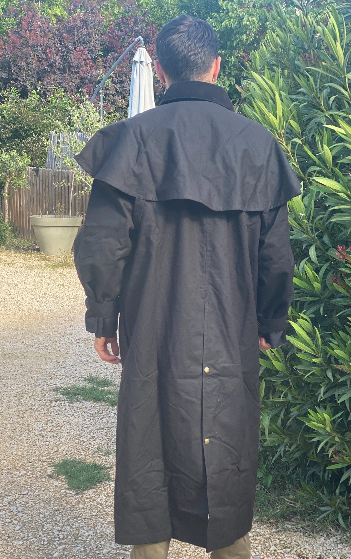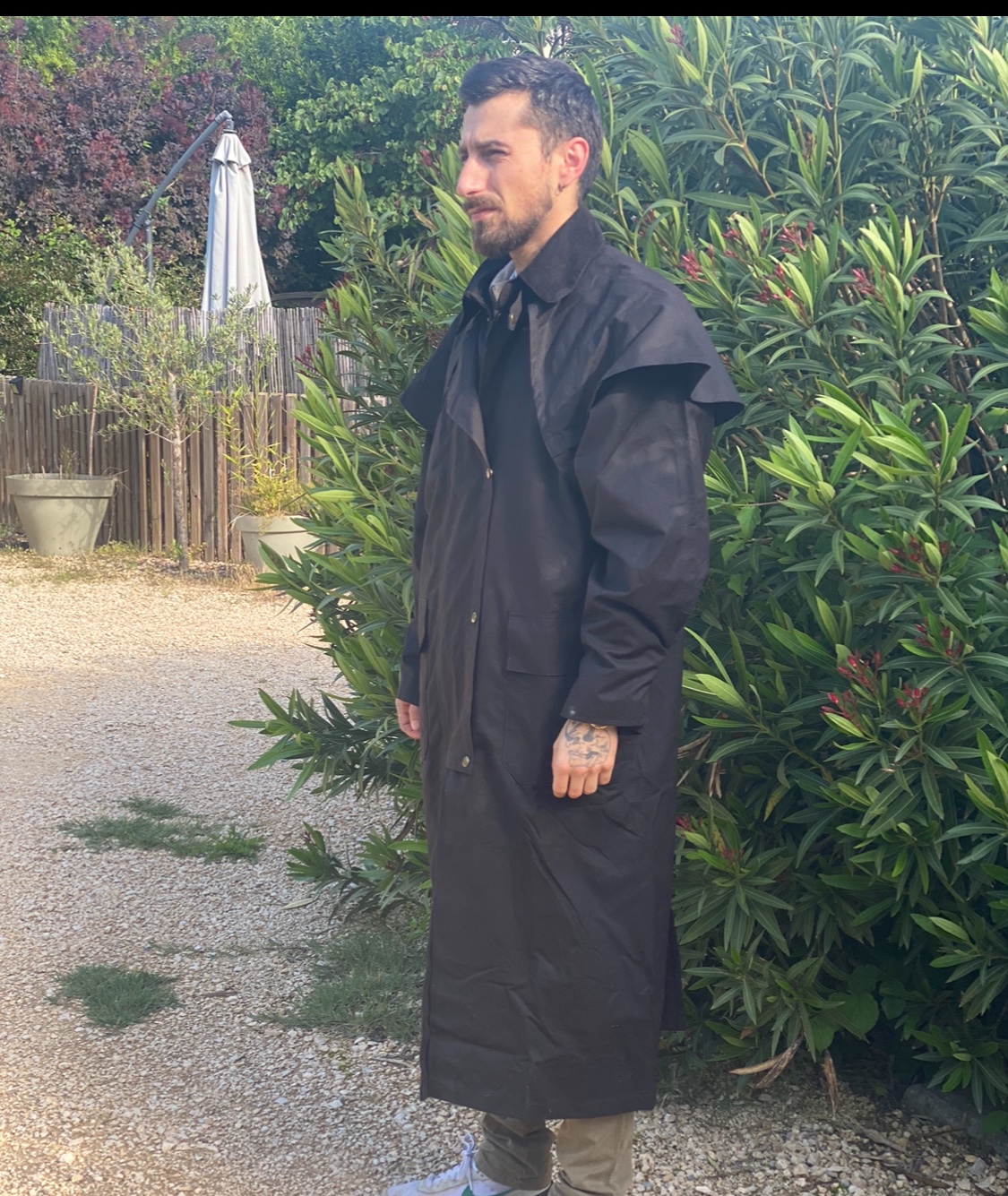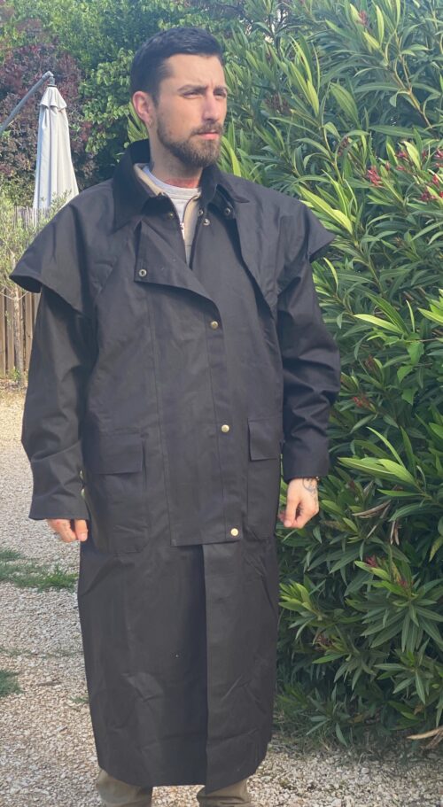 Le véritable manteau des bergers australiens qui restent des journées entières sous la pluie. En coton enduit, imperméable avec cape en coton huilé. Entièrement doublé en coton jusqu’à la ceinture. Fermeture à boutons pression sous patte. Patte de serrage à boutons pression aux manches. Extérieur du col en coton. Découpe de selle à soufflet avec boutons pression. Courroies de jambes. Fermeture du col par rabat à bouton pression pour une protection maximale contre le vent. A l’extérieur deux poches plaquées avec rabat. A l’intérieur une poche plaquée. ( Photo avec une taille L personne de 1,85m portant généralement du S ou M un peu grand pour lui )