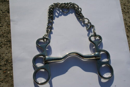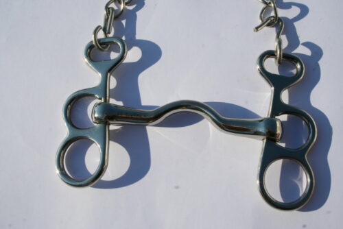 Mors coup de poing en inox avec passage de langue pour des ânes retissant au mors. Livré avec gourmette, Tailles 115 et 125.