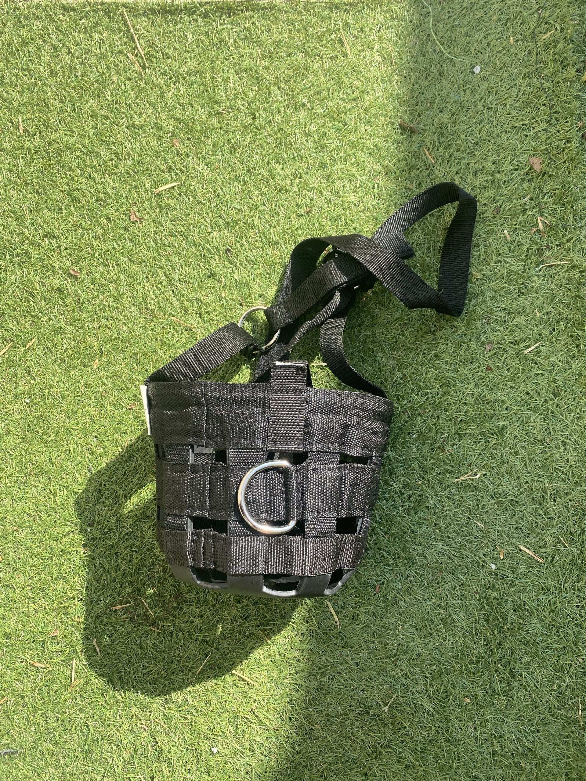 Muselière pour éviter une consommation excessive d’herbe. La têtière est sécuritaire d’un côté par un scratch , elle peut être réglée en continu au niveau de la nuque pour un ajustement individuel.Sa conception aérée permet e respirer sans entrave et offre un grand confort même par forte chaleur. ( anneau de guidage )