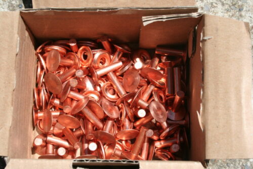Rivets cuivre à frapper, pour réparations ou fabrications. Diamètre 5 mm longueur du rivet 20 mm, boîte de 1 kilo comprenant 149 rivets et contre rivures.