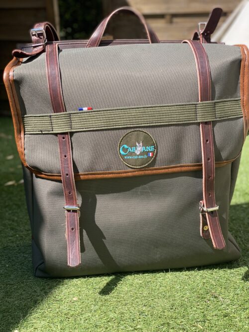 Fabrication artisanale dans notre atelier en Ardèche, sacoches en toile de l’armée très résistante quasi indéchirable et très imperméable, idéale pour les randonnées au long cours.Légères 4 kg la paire ! Sanglage cuir, renfort toile sur le pourtour pour la renforcer, rabat sur les couvercles pour une meilleure étanchéité, galon skaï, coloris vert. Dimensions : longueur 50 cm hauteur 50 cm profondeur 20 cm. La paire.