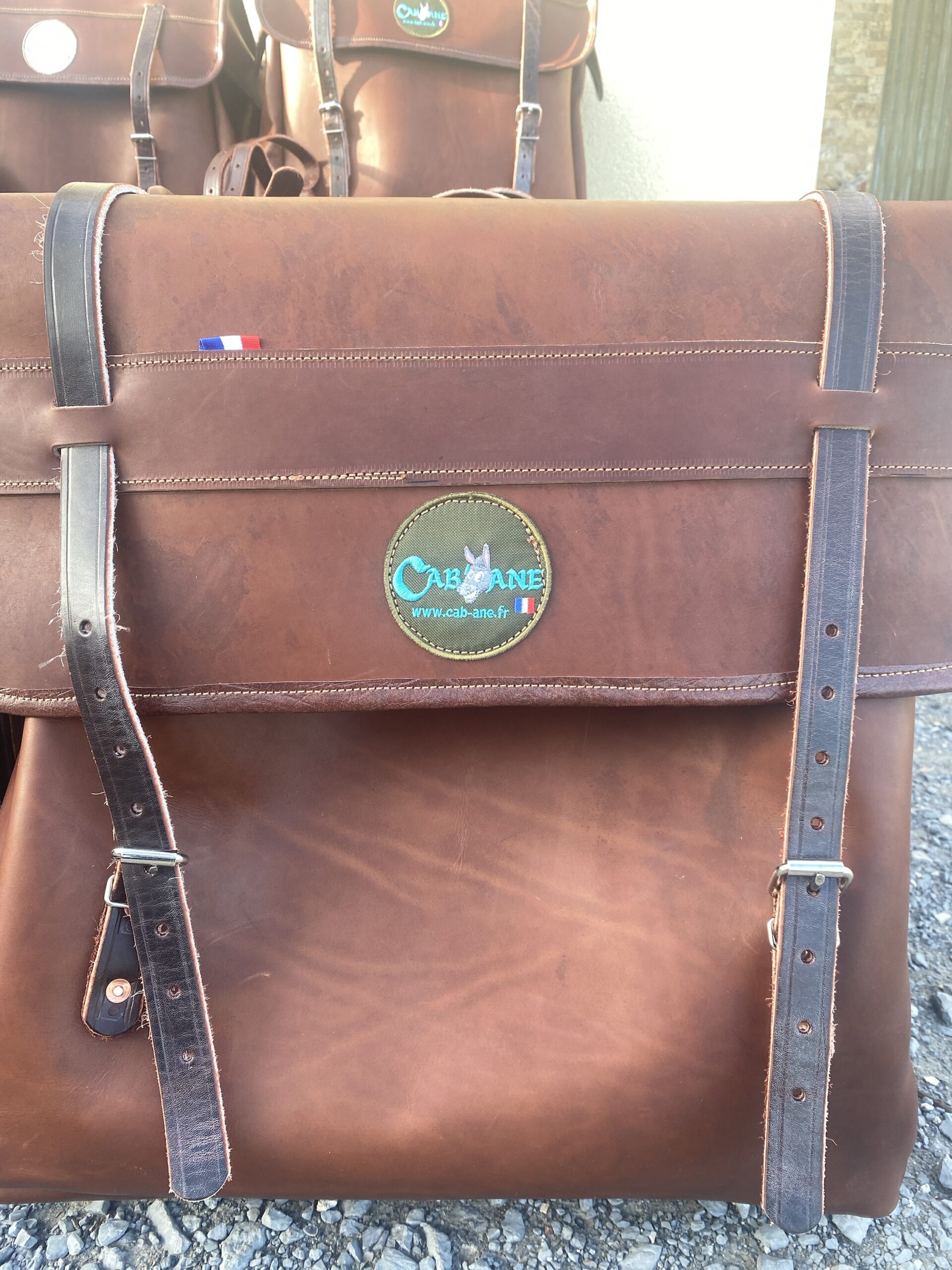 Fabrication artisanale dans notre atelier en Ardèche, sacoches en cuir petit modèle, utilisable sur n’importe quel bât, fixation par courroies de cuir réglables. Couvercle avec rabat et 2 courroies de fixation. Dimensions longueur: 50cm hauteur: 40 cm profondeur: 20cm. La paire.