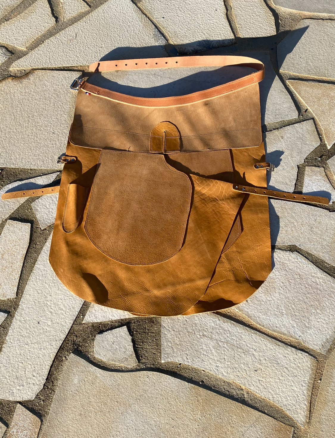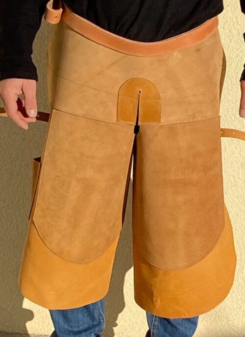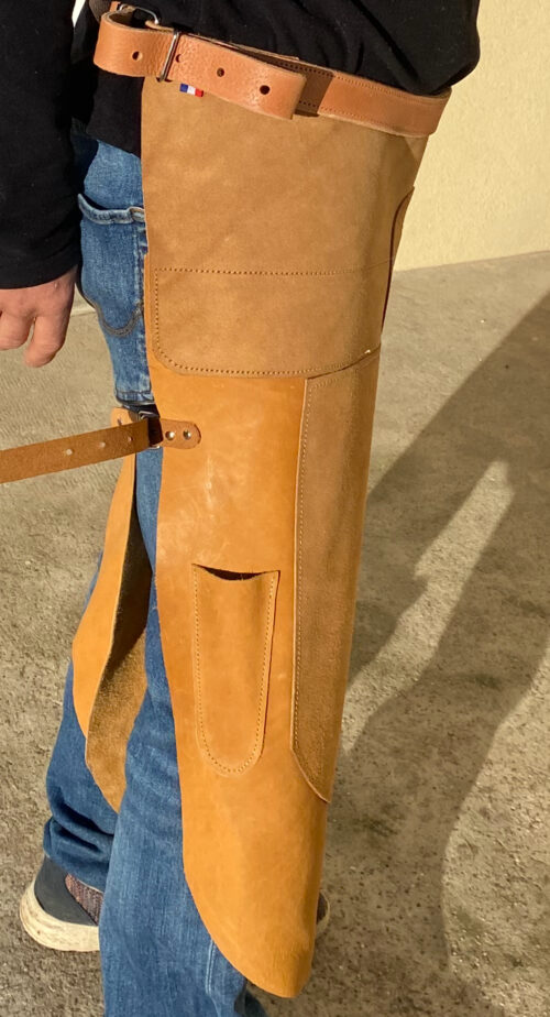 Fabrication artisanale, En cuir (coloris différent suivant arrivage), renforts, poche pour rénette, fixation ceinture et jambes. Idéal pour parage et ferrage.
