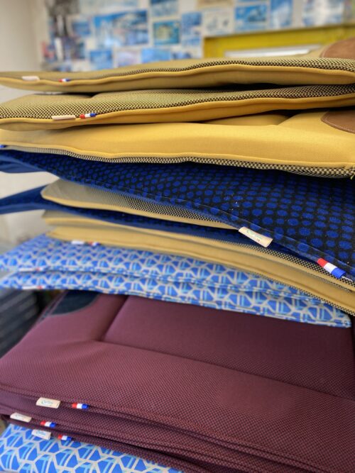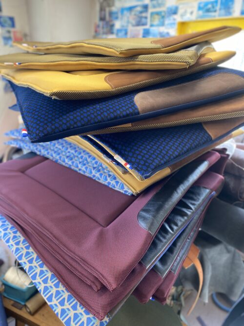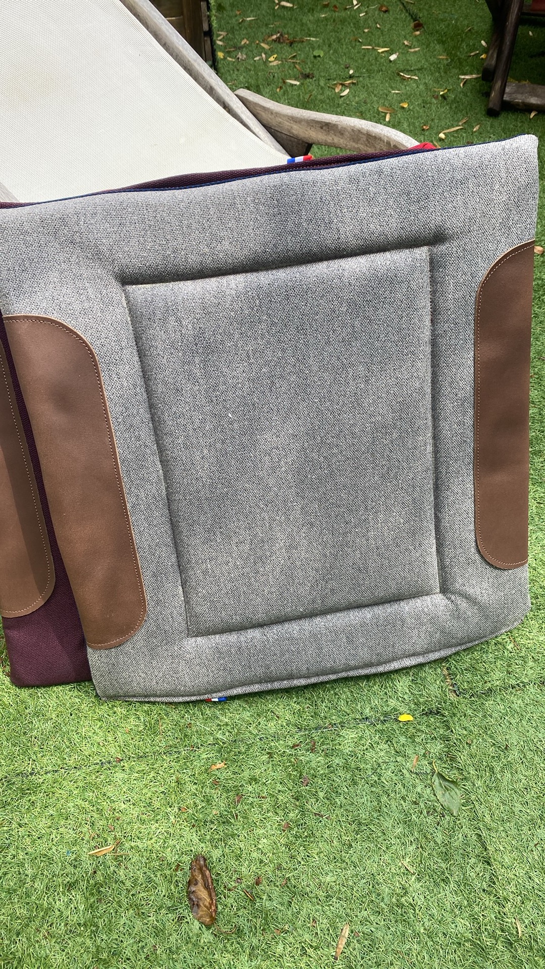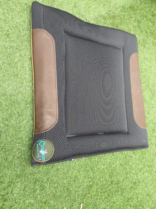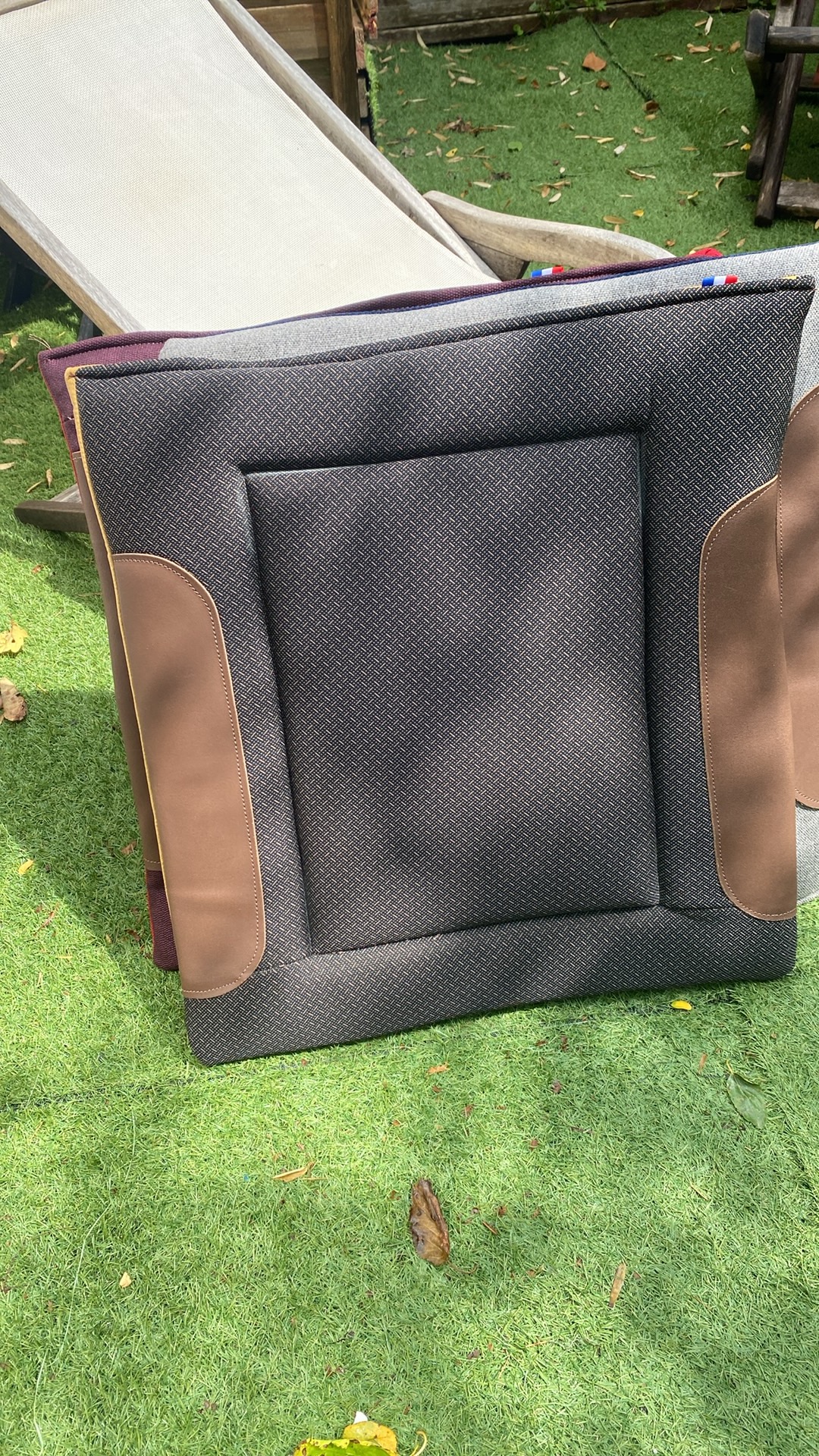 Tapis de fabrication artisanale, avec tissu assorti sur le dessus et le dessous. L’intérieur est composé d’une mousse confortable, incluant un renfort au passage de sangle, idéal pour une utilisation régulière ou un bâtage intensif.