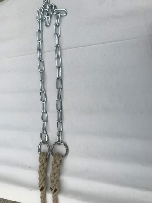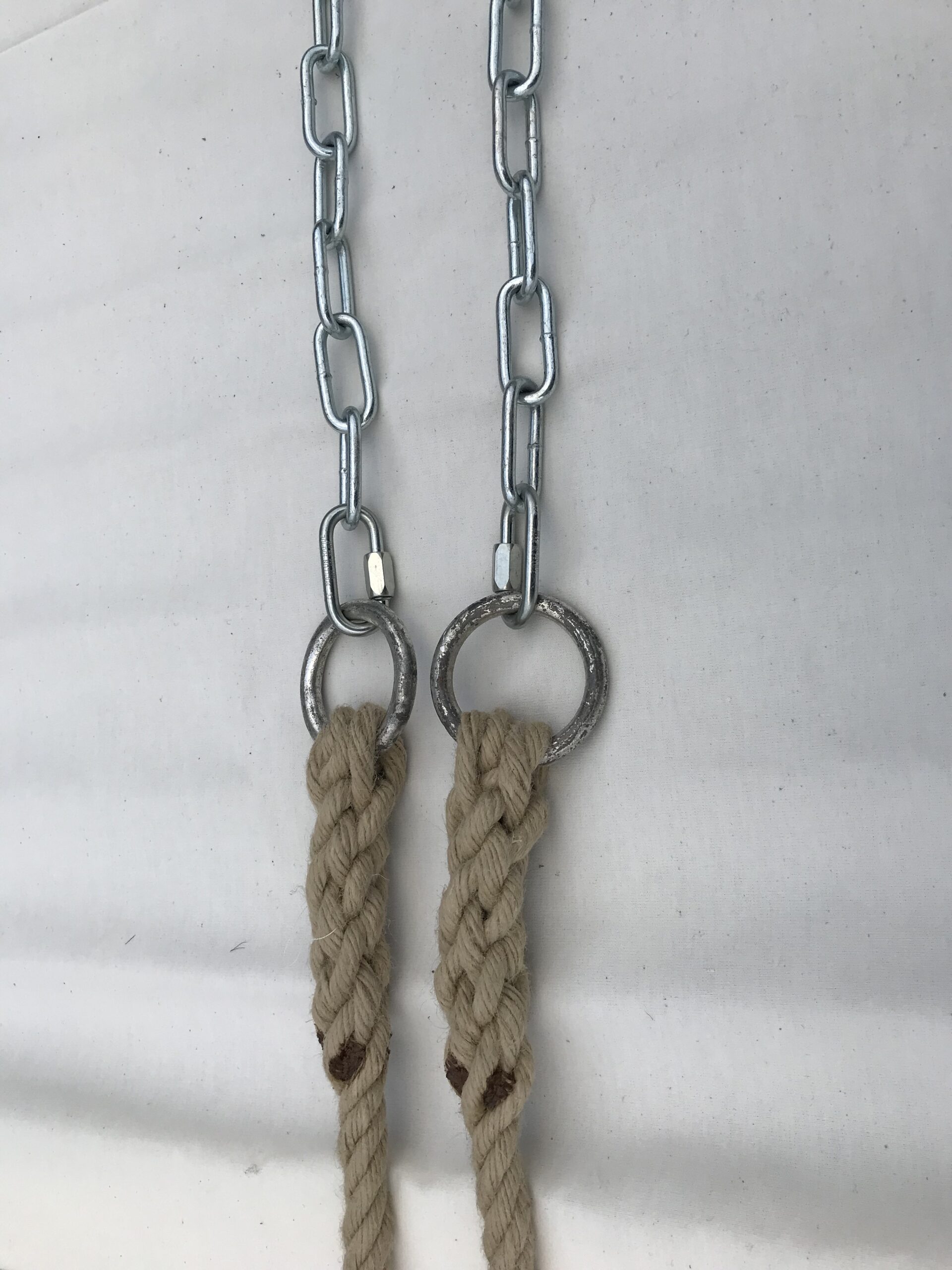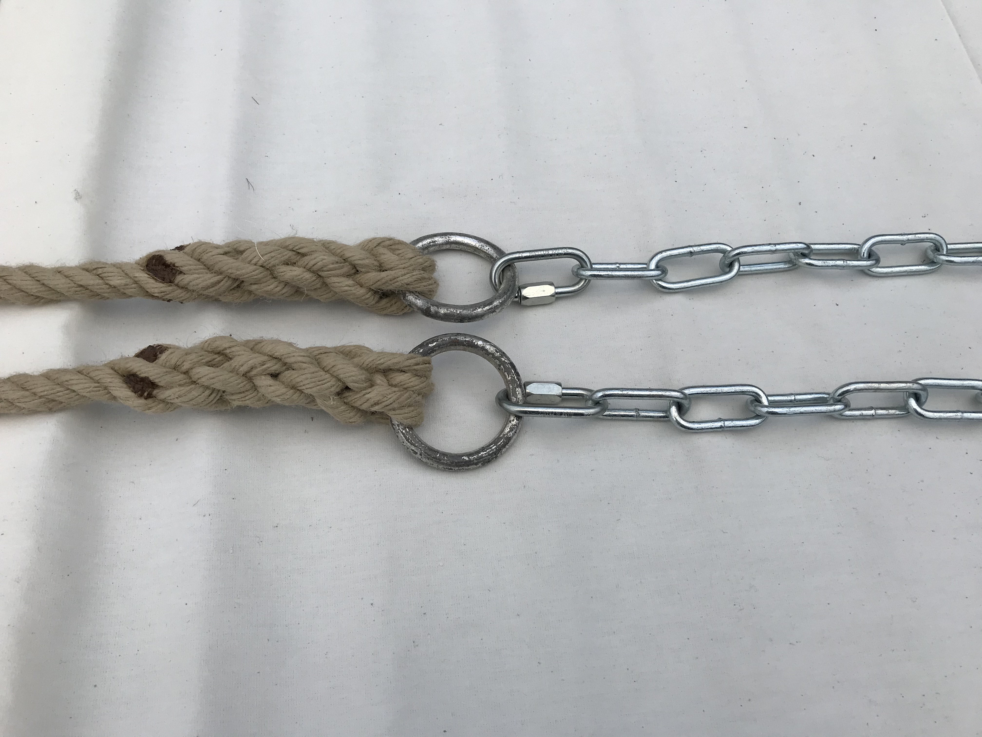 En polypropylène texturé imitation chanvre, très résistant, épissure très solide, anneaux soudés, longueur 150 cm + maillon rapide avec chaîne de 50 cm idéal pour bien régler la longueur souhaitée. La paire.